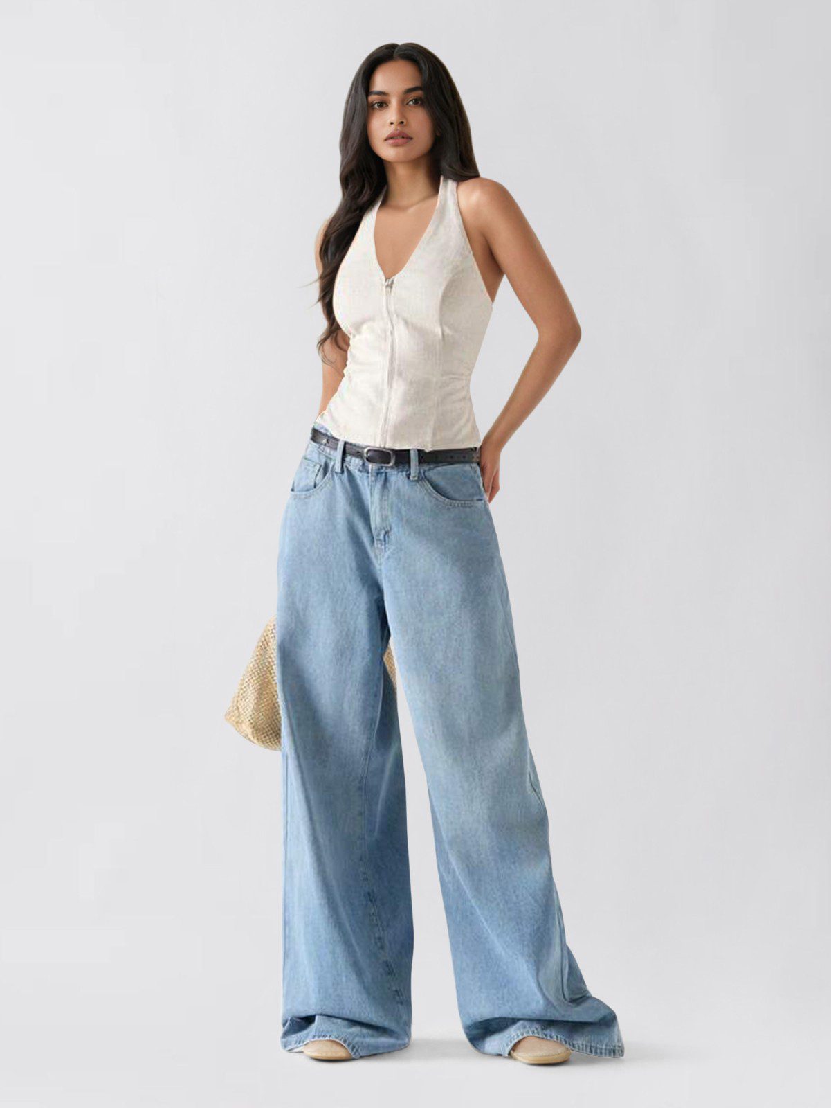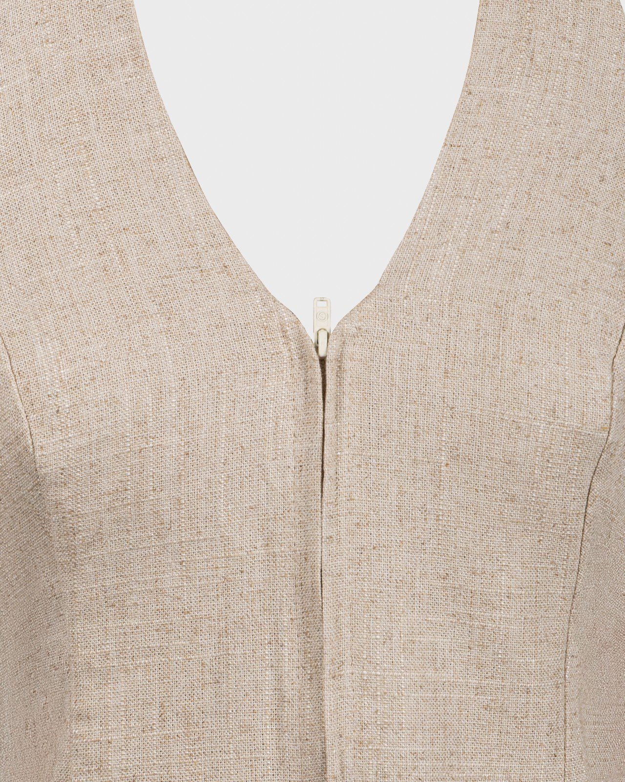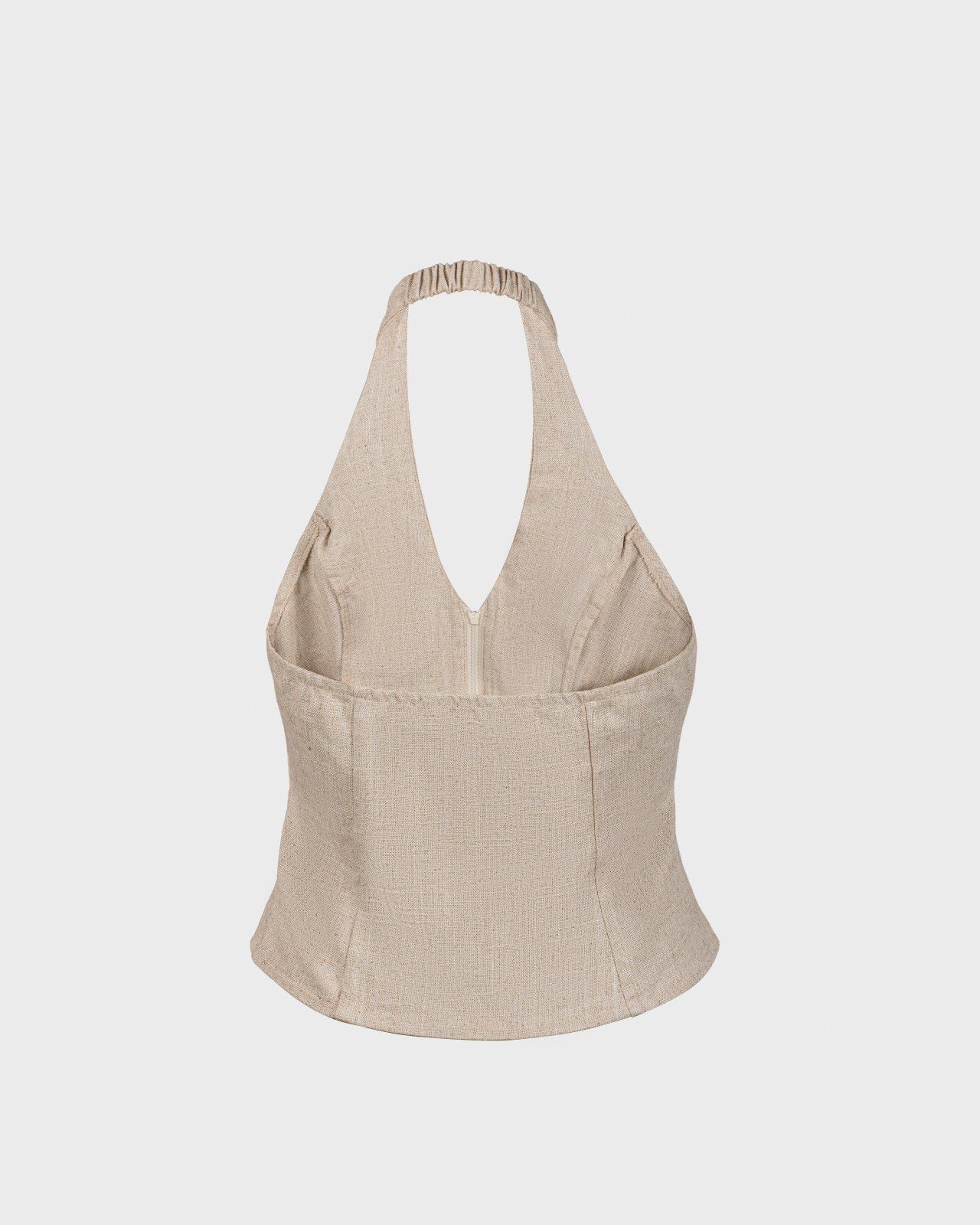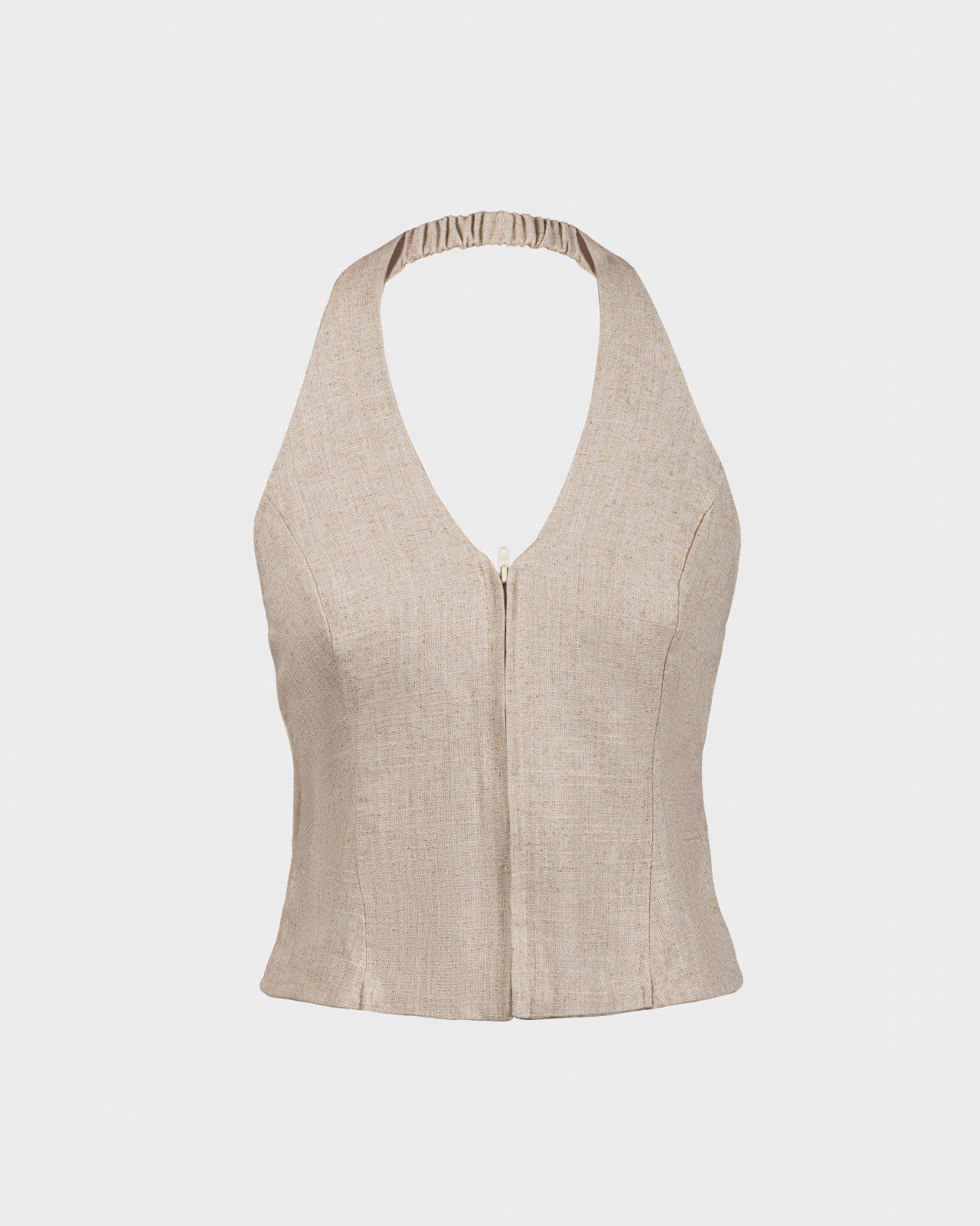 Lina is a minimalist halter top in raw-textured fabric, defined by a sleek zip-up front and effortless structure. Perfect for brunch or coffee run with the girls for those hot summer days
